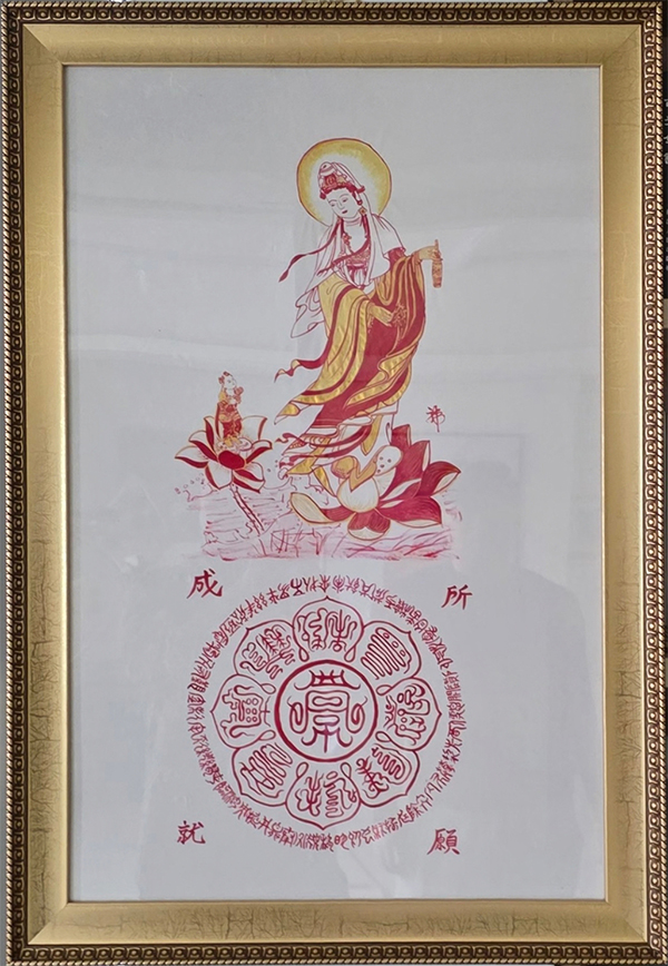 관세음보살님과 연화경의 힘을 빌어 만사가 대길하고 뜻 먹은 대로 마음 먹은 대로 매사에 뜻을 이루어 모든 일이 형통하고 소원을 성취하는 부로서 거실이나 방문위나 사무실에 걸어두고 지극정성으로 기도하면 바라는 모든 것을 얻게 되는 부적입니다.